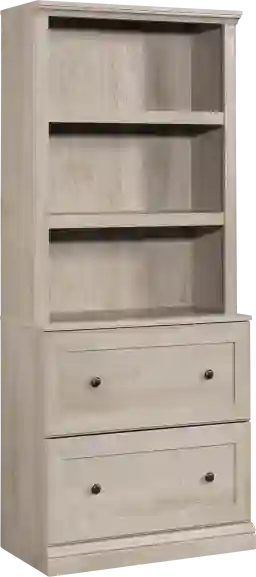 The Mazehut gray bookcase has two adjustable shelves to add versatile display options. Two spacious drawers feature metal runners and safety stops. Quick and easy assembly with slide-on moldings and T-lock drawer system. Customer assembly is required.