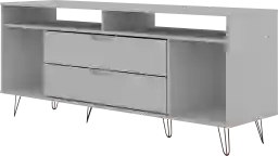 The Mcbean tv stand is the living room mainstay that's both the perfect media and entertainment focal point with ample storage space perfect for keeping DVD players and media accessories on display in lower open shelves beneath the TV or tucked away in two seamless lower drawers. Two open shelves on each side offer space for showcasing decorative accents baskets filled with your softest throw, and beyond. Stylish with splayed metal legs and Mid-Century design at its best, this piece gathers family and friends to create new memories together and to enjoy favorite movies. Customer assembly is required.