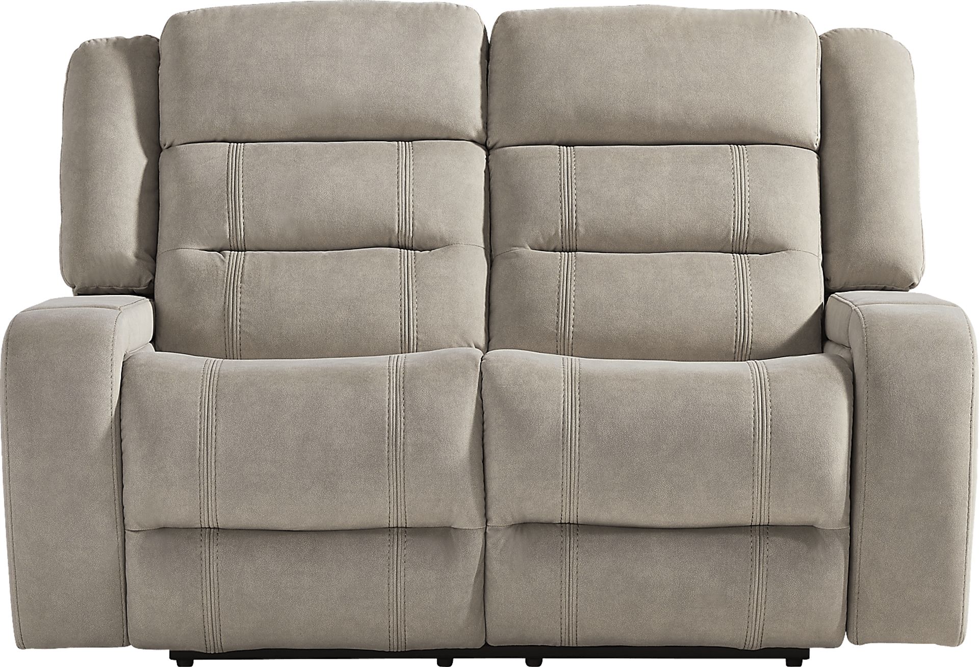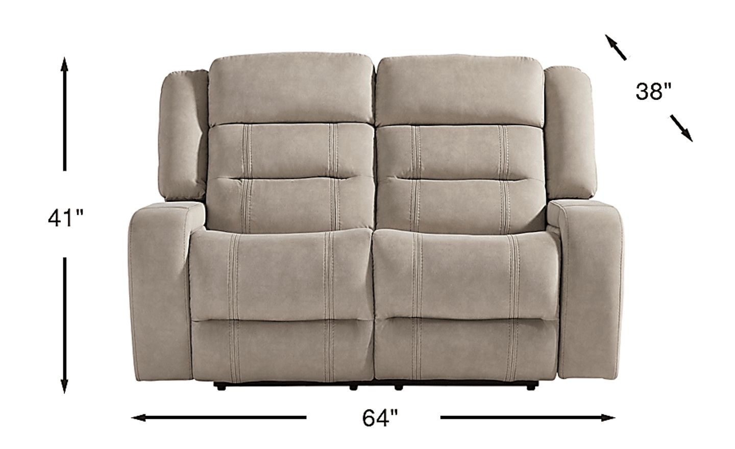 A calming hush settles, the room begins to feel less like a place and more like a quiet, comfortable pause as the McKinley collection's soft textures and clever luxury invite effortless relaxation. This classically styled loveseat is wrapped in soft beige microfiber and showcases generously deep tufting for a cloudlike silhouette. Contrasting top-stitched seams add tailored definition throughout, while the seats and back feature highly decorative double stitching for a refined touch. Hidden cupholders tucked into the arms offer a sleek solution for keeping drinks within reach. Upholstery: 100% polyester.
