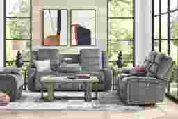 A calming hush settles, the room begins to feel less like a place and more like a quiet, comfortable pause as the McKinley collection's soft textures and clever luxury invite effortless relaxation. This classically styled sofa is wrapped in soft graphite gray microfiber and showcases generously deep tufting for a cloudlike silhouette. Contrasting top-stitched seams add tailored definition throughout, while the seats and back feature highly decorative double stitching for a refined touch. Hidden cupholders tucked into the arms offer a sleek solution for keeping drinks within reach, while the center fold-down table includes extra cupholders, a storage pocket and wireless charging. For a delightful final touch, power reclining includes power adjustable footrest and USB charging ports set into the control panels. Upholstery: 100% polyester.