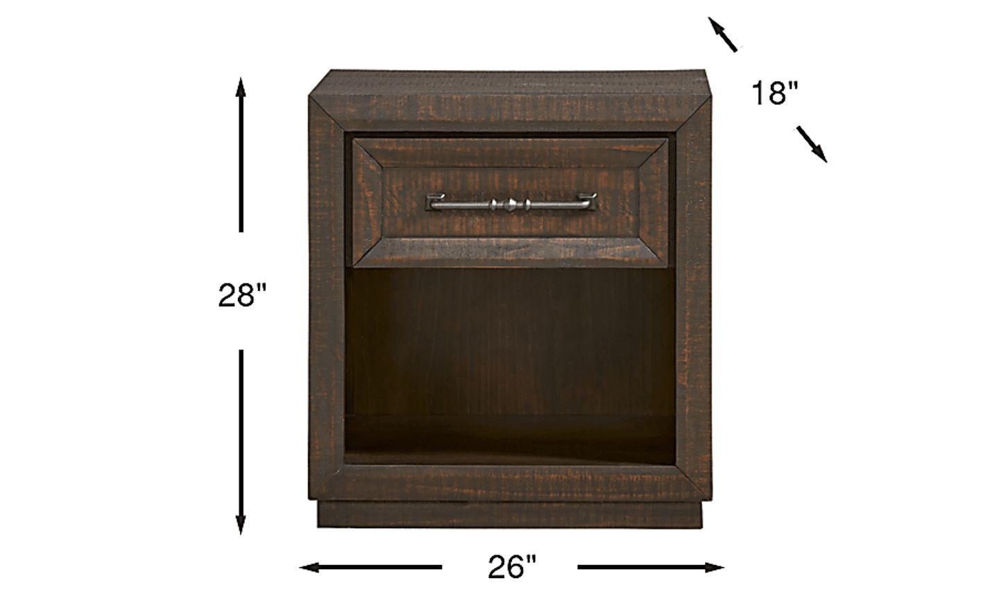 The quiet strength of a mountainside lodge taking in the crisp air of a morning breeze comes to life in the Mckinnon collection's tailored character, thoughtful details, and charming warmth. Rustic in style, this nightstand comes in a rich dark brown finish and features a plinth-style base for a seamless, grounded look. Store away your bedside essentials in the single drawer and display your favorite decorations on the open bottom shelf. Integrated LED lights add a touch of ambient luxury while built-in USB ports provide convenient device charging. Custom iron gray bar pulls complete the ensemble with elevated details.