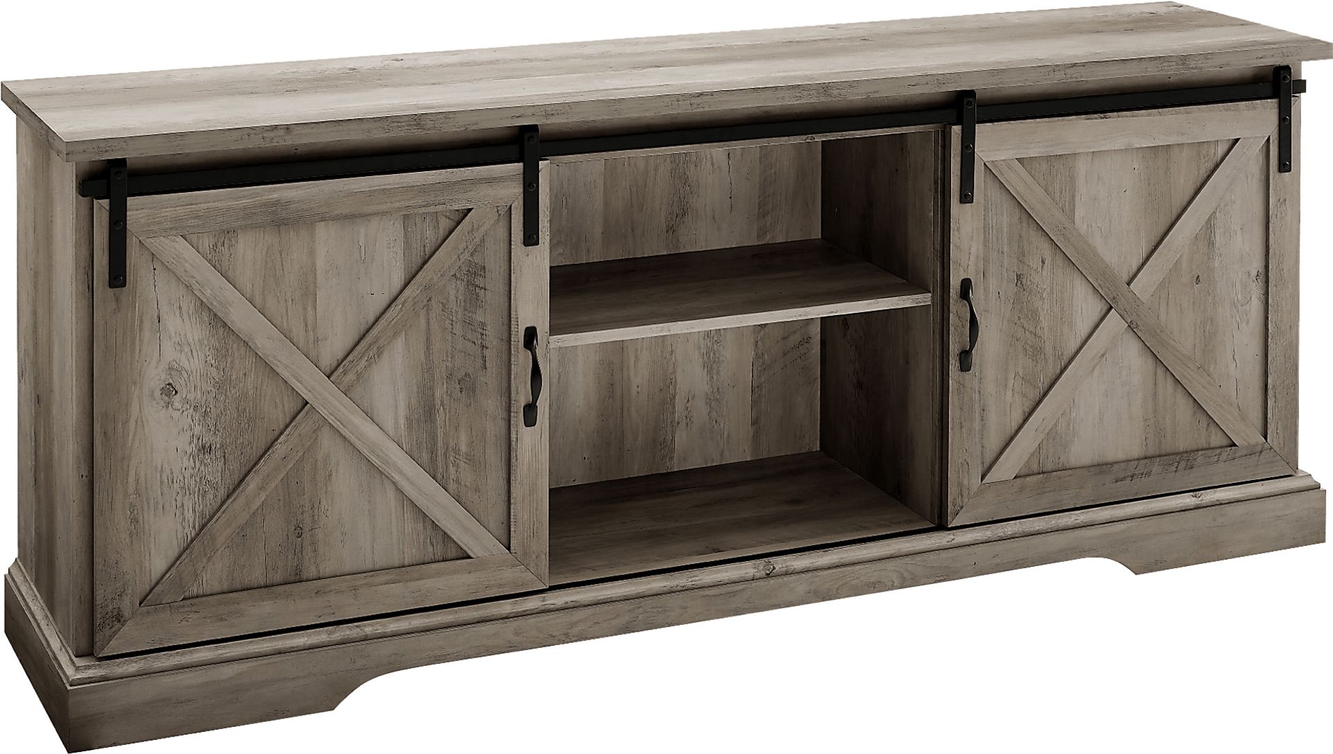 Slide open your new barn doors and showcase your best media components with this charming Meador farmhouse TV stand. This rustic console hosts three adjustable shelves, perfect to for holding all your favorite video games, movies, or home decor. Its two-tone look offers a chic, country pop to any room. Smooth, powder-coated steel allows a seamless glide to the darling barn door design. Dress it up for a classy chateau atmosphere or keep it simple to emulate a pastoral cottage aura. And with cord management ports for your electronic cables, the media stand stays oh-so tidy. Use this versatile piece in your living room, dorm, bedroom, or home office. Customer assembly is required.