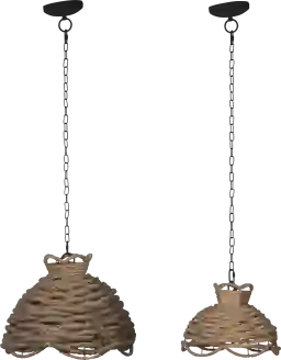 Bring rustic personality to your interior with these creative rope chandeliers. These chandeliers are crafted from hemp rope over an iron frame for a fantastic combination of natural charm and rugged industrial construction. Because these chandeliers come in a set of two, they are a fantastic choice for decorative groupings in places like corners or atriums. Recommended to be installed by a professional electrician.