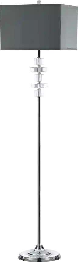 One thing is crystal clear about the Mecca Court Silver Floor Lamp it oozes absolute class. This sleek chrome candlestick lamp, with its square grey shade, round base, and chrome finial is punctuated by geometric crystals. Partial assembly may be required.