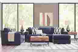 Luxurious intimacy and cozy warmth come together to elevate every minute of quality time spent in the Drew & Jonathan Melbourne living room. This casual contemporary set is upholstered in relaxed midnight blue chenille fabric complemented by a thoughtfully tailored appearance, complete with sophisticated track arms and low-profile block legs finished in warm brown. Plush, removable seat cushions allow for easy adjustment and maintenance. The two matching accent pillows on the sofa chaise are contrasted by two coordinating accent pillows as well as one additional pillow included with the chair. Upholstery: 95% Polyester, 5% Linen. Cleaning Instructions: Use water-based cleaning agents or foam. Tables and lamp not as shown in room image. Small white accent pillow not included.