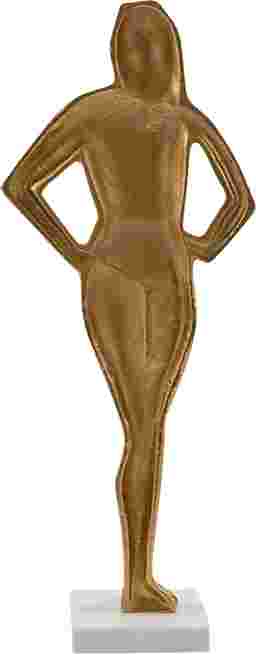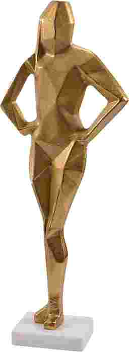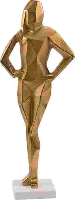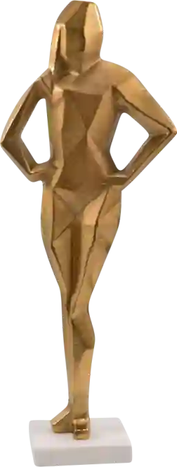 Embody elegance and strength with the Melicu sculpture, introduce a touch of timeless grace and modern sophistication to your space with this stunning gold metal sculpture of a woman. Poised and elegant, the figure stands with her hands placed confidently on her hips and her feet together, creating a striking, unified silhouette. The smooth gold finish reflects light beautifully, adding a warm glow that brings life to any room. Resting on a sleek white marble base, this sculpture exudes both luxury and simplicity, making it the perfect statement piece for your living room, office, or entryway. The clean lines and minimalist design allow the artistry of the piece to shine, making it an eye-catching focal point that enhances any interior. Whether you're drawn to its graceful form or its powerful symbolism, this woman figurine sculpture is a beautiful way to add strength, elegance, and refinement to your home. Customer assembly is required.