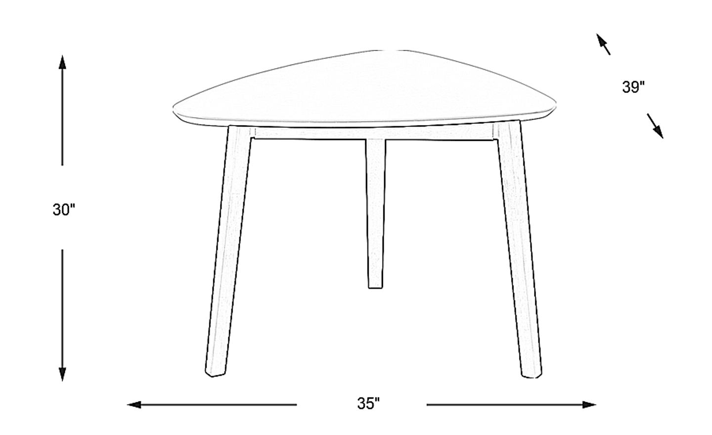 With its unique 39" x 35" triangular silhouette, this dining table is designed to comfortably seat up to three people. Its compact footprint makes it an ideal choice for intimate meals or as a dedicated breakfast nook in a kitchen.
