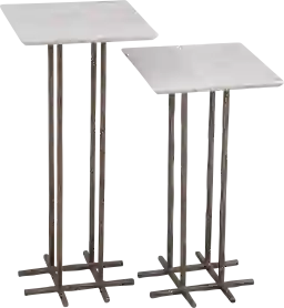 The Melqua white accent table, set of 2 features modern inspired style. This two-piece accent table set features hand-hammered iron bases, each finished in antique gold. The square tabletops are white marble. Customer assembly is required.