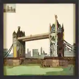 The London Bridge stands as a symbol of unity and connection in the Membrillo multi artwork. Its arches symbolize the unbreakable bond between lovers, as they traverse the bridge hand in hand, embarking on a journey of love and adventure. The attention to detail portrays the bridge's strength, echoed in the strength of love that withstands the test of time, encased under glass and embraced within a black shadow box frame. This dimensional collage reveals the artist's profound appreciation for London's charm. It's as if the artwork whispers tales of romance, secrets shared beneath the bridge's arches, and stolen kisses against the backdrop of the city's lights. The collage invites you to immerse yourself in the magic of London, to feel the heartbeat of the city pulsating through your veins.