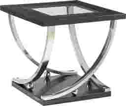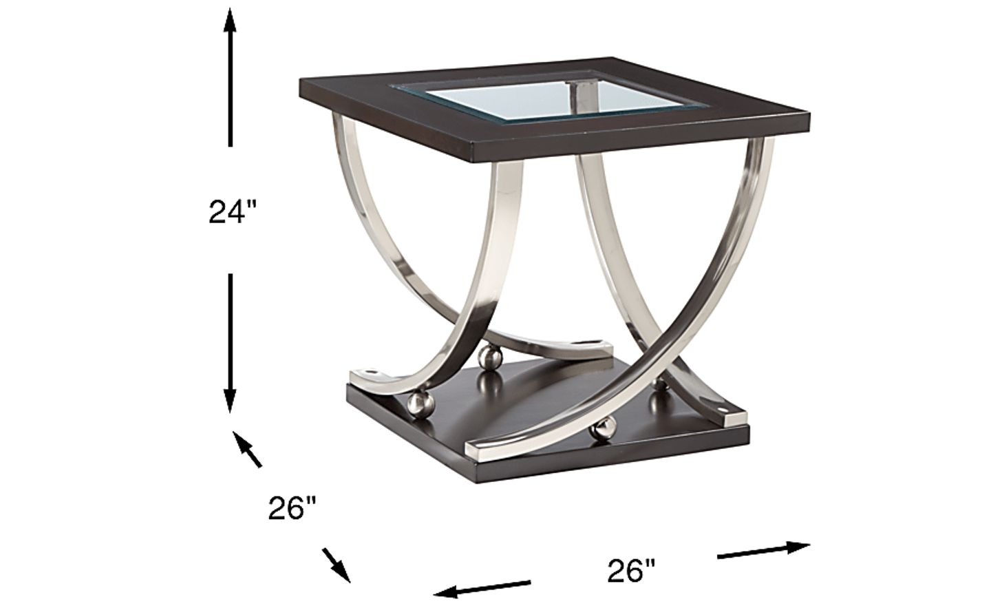 Featuring a chic contemporary style, the Menlo Park end table adds a modern touch to any living space. Crafted of birch solids and cherry veneers in a rich dark merlot finish, this sleek end table features sweeping brushed nickel finished bars and spherical orbs. An inset glass panel on the table top adds to the mixed material appeal of this stylish table.