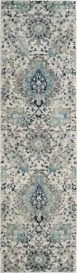 Absolutely. The 2'3" x 8' dimensions are specifically tailored for the narrow transitional spaces common in urban apartment living. The contemporary design, featuring blue shades against a light gray and cream background, helps brighten dark or windowless hallways, creating the illusion of a more open and inviting space without overwhelming the limited floor area.
