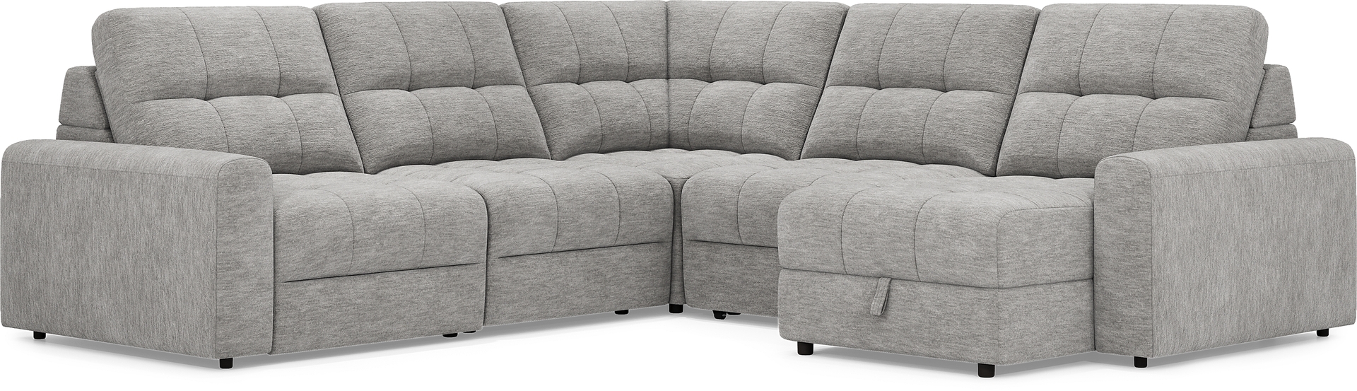 With the serene ease of a luxurious spa day, the Meriwether collection soothes the day away and offers up ultimate relaxation. This spacious contemporary sectional boasts sophistication and tranquility with wide track arms and plush tufted back and seat cushions wrapped in soft, gray chenille. Each of the sectional's five individual pieces is upholstered on all sides, creating opportunities for reconfiguration and individual use. On the right, convenient storage in the chaise provides room for extra blankets, pillows and more. The power sliding feature built into one of the armless chairs allows you to adjust the seat depth to your liking and kick your feet up for perfect relaxation. Additionally, the left side of the sectional has a power reclining seat with controls built into the inner arm. The control panel is also equipped with ultra convenient USB-charging. Includes LAF chaise, power armless slider, corner wedge, armless chair, console, and power RAF recliner. Upholstery: 100% polyester.