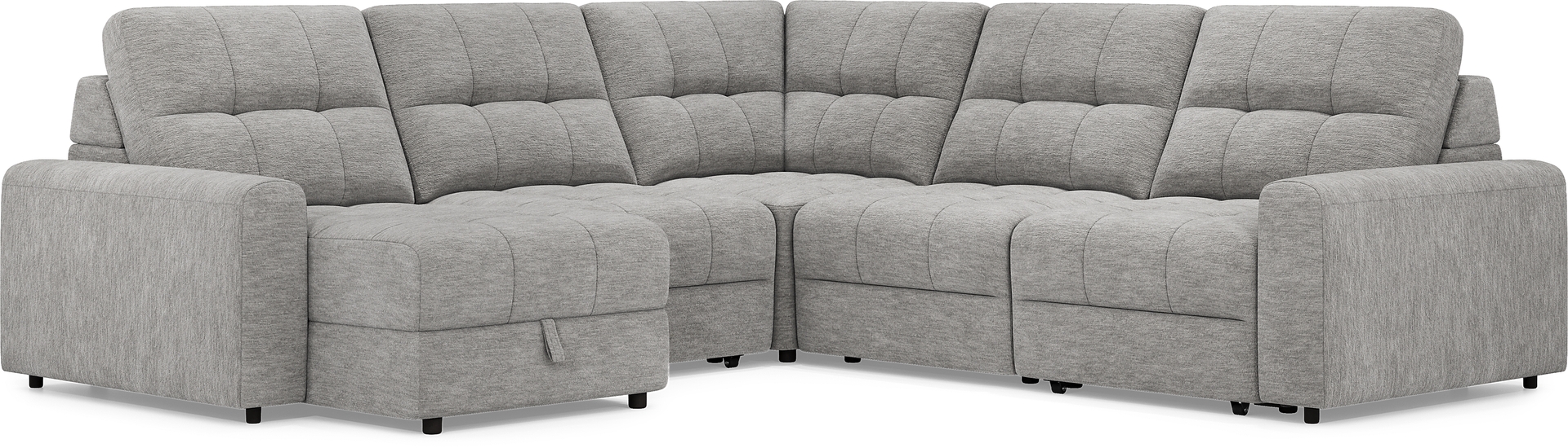 With the serene ease of a luxurious spa day, the Meriwether collection soothes the day away and offers up ultimate relaxation. This spacious contemporary sectional boasts sophistication and tranquility with wide track arms and plush tufted back and seat cushions wrapped in soft, gray chenille. Each individual piece is upholstered on all sides, creating endless opportunities for reconfiguration and individual use. The power sliding feature allows you to adjust the seat depth to your liking and kick your feet up for perfect relaxation. Additionally, this sectional features convenient storage in its chaise providing plenty of room for extra blankets, pillows and more. Includes LAF chaise, power armless slider, corner wedge, armless chair, power RAF slider.