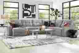 With the serene ease of a luxurious spa day, the Meriwether collection soothes the hours away and offers up ultimate relaxation. This spacious contemporary sectional boasts sophistication and tranquility with wide track arms and plush tufted back and seat cushions wrapped in soft, gray chenille. Each individual piece is upholstered on all sides, creating endless opportunities for reconfiguration and individual use. The power sliding feature allows you to adjust the seat depth to your liking and kick your feet up for perfect relaxation. Additionally, this sectional features convenient storage in its chaise providing plenty of room for extra blankets, pillows and more. Includes LAF chaise, power armless slider, 2 armless chairs, corner wedge, power RAF slider. Upholstery: 100% polyester.
