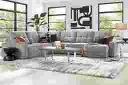With the serene ease of a luxurious spa day, the Meriwether collection soothes the hours away and offers up ultimate relaxation. From the chaise to the wedge to the recliner, this spacious, contemporary sectional boasts sophistication and tranquility with wide track arms and plush tufted back and seat cushions wrapped in soft, gray chenille. Each of the six pieces is upholstered on all sides, creating opportunities for reconfiguration and individual use. On the left, the sectional features a power reclining seat with controls built into the inner arm. The power sliding feature allows you to adjust the depth on one of the three armless seats to your liking and kick your feet up for perfect relaxation. Additionally, convenient storage in the right arm facing chaise provides room for extra blankets, pillows and more. Upholstery: 100% Polyester. Cleaning Instructions: Use water based cleaning agents or foam.
