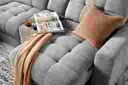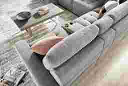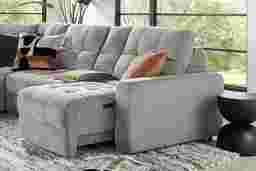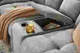 With the serene ease of a luxurious spa day, the Meriwether collection soothes the hours away and offers up ultimate relaxation. This spacious contemporary sectional boasts sophistication and tranquility with wide track arms and plush tufted back and seat cushions wrapped in soft, gray chenille. Each individual piece is upholstered on all sides, creating endless opportunities for reconfiguration and individual use. The power sliding feature allows you to adjust the seat depth to your liking and kick your feet up for perfect relaxation. Additionally, this sectional features convenient storage in its chaise and console providing plenty of room for extra blankets, pillows and more. The console also includes removeable stainless steel cup holders for a convenient final touch. Includes LAF chaise, 2 power armless sliders, corner wedge, armless chair, console, power RAF slider. Upholstery: 100% polyester.