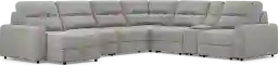 With the serene ease of a luxurious spa day, the Meriwether collection soothes the hours away and offers up ultimate relaxation. This spacious contemporary sectional boasts sophistication and tranquility with wide track arms and plush tufted back and seat cushions wrapped in soft, gray chenille. Each individual piece is upholstered on all sides, creating endless opportunities for reconfiguration and individual use. The power sliding feature allows you to adjust the seat depth to your liking and kick your feet up for perfect relaxation. Additionally, this sectional features convenient storage in its chaise and console providing plenty of room for extra blankets, pillows and more. The console also includes removeable stainless steel cup holders for a convenient final touch. Upholstery: 100% Polyester.