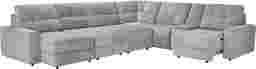 With the serene ease of a luxurious spa day, the Meriwether collection soothes the hours away and offers up ultimate relaxation. This spacious contemporary sectional boasts sophistication and tranquility with wide track arms and plush tufted back and seat cushions wrapped in soft, gray chenille. Each individual piece is upholstered on all sides, creating endless opportunities for reconfiguration and individual use. The power sliding feature allows you to adjust the seat depth to your liking and kick your feet up for perfect relaxation. Additionally, this sectional features convenient storage in its chaise and console providing plenty of room for extra blankets, pillows and more. The console includes removeable stainless steel cup holders for a convenient final touch. Includes LAF chaise, power armless slider, corner wedge, 2 armless chairs, console, power RAF slider. Upholstery: 100% polyester.