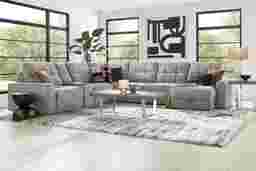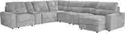With the serene ease of a luxurious spa day, the Meriwether collection soothes the hours away and offers up ultimate relaxation. This spacious contemporary sectional boasts sophistication and tranquility with wide track arms and plush tufted back and seat cushions wrapped in soft, gray chenille. Each individual piece is upholstered on all sides, creating endless opportunities for reconfiguration and individual use. The power sliding feature allows you to adjust the seat depth to your liking and kick your feet up for perfect relaxation. Additionally, this sectional features convenient storage in its chaise and console providing plenty of room for extra blankets, pillows and more. The console includes removeable stainless steel cup holders for a convenient final touch. Includes RAF chaise, power armless slider, corner wedge, 2 armless chairs, console, power LAF slider. Upholstery: 100% polyester.