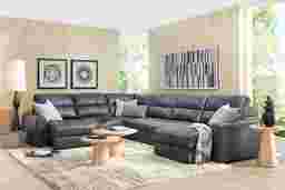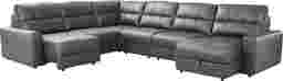 With the serene ease of a luxurious spa day, the Meriwether collection soothes the hours away and offers up ultimate relaxation. This spacious contemporary sectional boasts sophistication and tranquility with wide track arms and plush tufted back and seat cushions wrapped in luxurious top grain leather where the body touches. Each individual piece features all-sides upholstery, creating endless opportunities for reconfiguration and individual use. The power sliding feature allows you to adjust the seat depth to your liking and kick your feet up for perfect relaxation. Additionally, this sectional features convenient storage in its chaise, providing plenty of room for extra blankets, pillows and more. Upholstery: top grain leather where the body touches, vinyl sides and back.