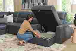 This sectional is designed for multi-functional living and includes integrated storage within the chaise. This hidden compartment is an ideal solution for keeping your living area organized, providing ample room to tuck away extra throws, pillows, or media accessories so they are always within reach but out of sight.