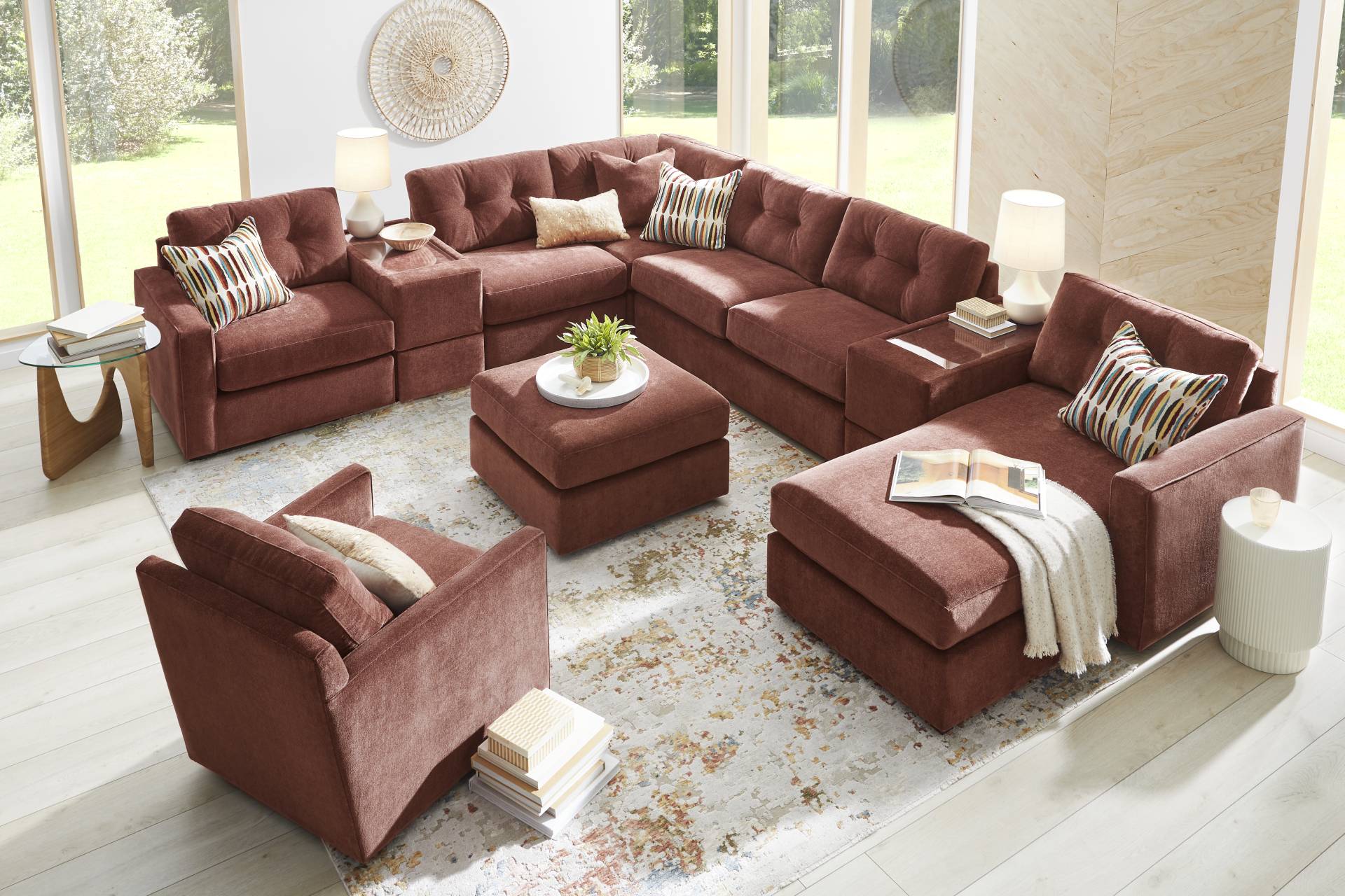 Discover the limitless possibilities of the Drew & Jonathan ModularOne, thoughtfully designed with comfort and flexibility in mind. This customizable seating solution features individual pieces that can be reconfigured to the shape you need for game days, sleepovers, or just everyday relaxation. Each piece is upholstered on all sides in our signature fabric, New Horizon. This soft, merlot chenille includes Repreve yarn, made with recycled plastic bottles. The collection boasts welted track arms, top-stitched seat cushions and tufted back cushions for an elegant silhouette. Two center consoles provide hidden storage and double as side tables with sleek acrylic tops. A Nature's Bed gel foam mattress is tucked inside the armless loveseat for guests who would like to extend their stay. Includes RAF chaise, LAF seat, two consoles, wedge seat, armless chair, and loveseat. Upholstery: 100% Polyester.