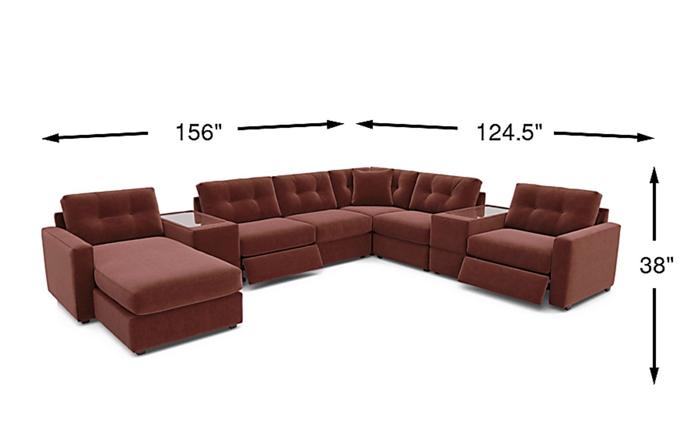 With a total footprint of 156 inches wide by 124.5 inches deep, this set is scaled for larger living areas or dedicated media rooms. To ensure a comfortable flow in your space, we recommend leaving 18–24 inches of clearance for walkways around the sectional. Because it is modular, it is also a strategic choice for open-concept homes where you can use the pieces to delineate specific "zones" for lounging and entertaining.