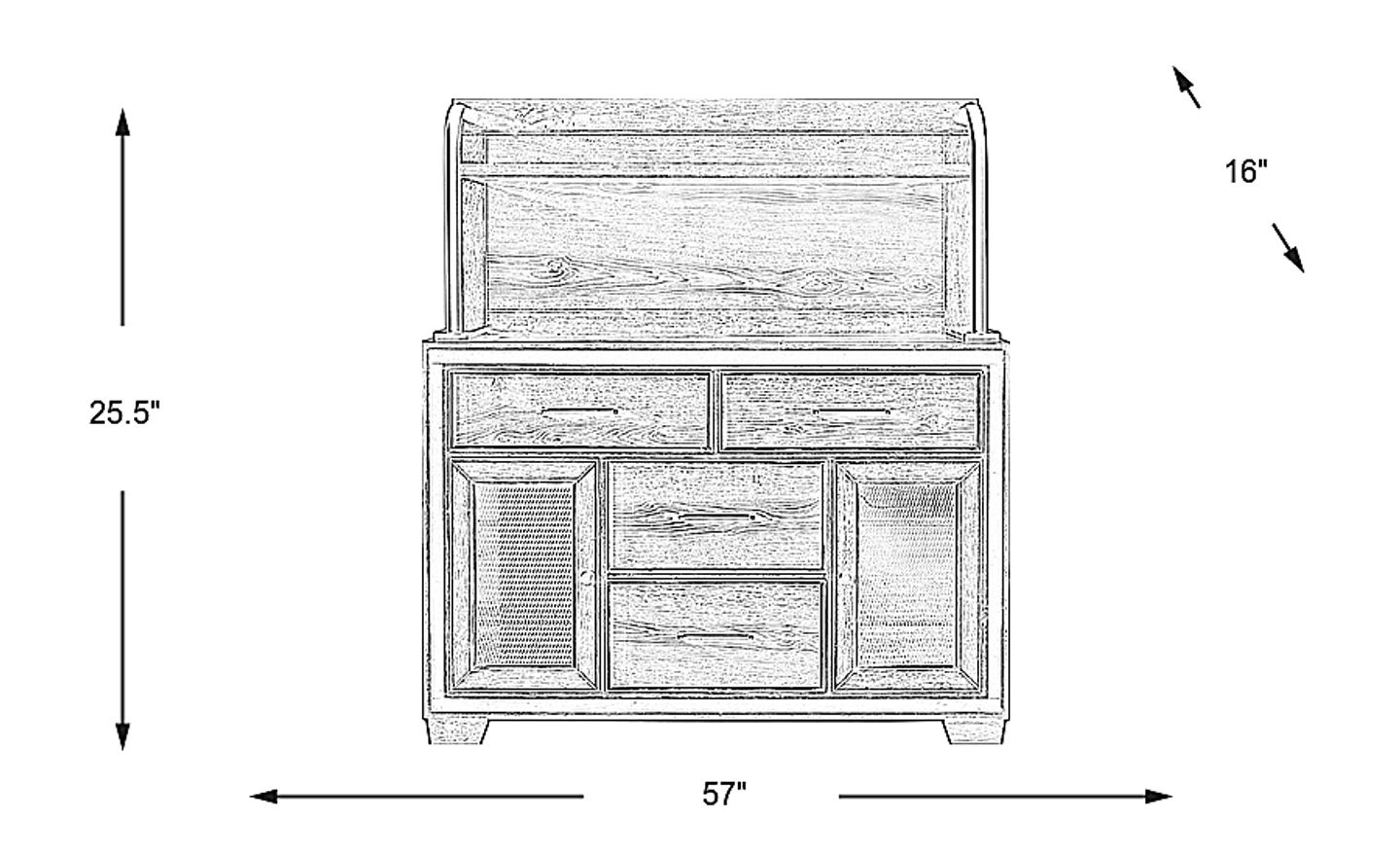 Enhance your dining area with the industrial-inspired Merna Falls server with hutch. Carefully crafted with oak veneers, this piece features a rich oak finish for a natural look. Its four drawers include silver-finished hardware that offers sophisticated style. Designed for flatware and other household items, additional storage is revealed behind two tempered glass doors. Adjustable shelves inside make it easy to customize your space. Plus, a black border along the inner edge creates a clean, streamlined appearance. Sitting atop the server, the included Merna Falls hutch adds an upper shelf for displaying decor. This hutch boasts a metal bar on each side to accentuate the collection's modern-industrial style.