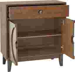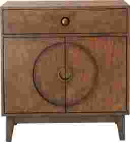 The Merriott Accent Cabinet is a lovely addition to your home. Birch veneers are finished in a warm walnut that highlights the beauty of the wood grain. Recessed burnished brass hardware echoes the circle motif on the door fronts. Offering ample storage space, the accent cabinet includes an adjustable shelf in the interior and a drawer with full extension guides. Customer assemby required.
