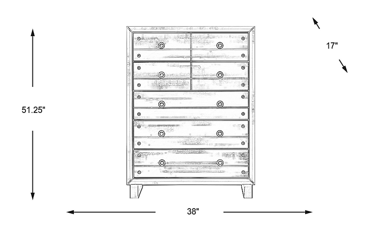 Rustic, contemporary craftsmanship makes the Merriwood Hills chest a stylish storage piece. Made of pine solids, this piece displays wood plank styling that evokes a natural, rugged look. The two-tone white and gray finish is distressed throughout, magnifying its industrial appeal. Five spacious drawers, ideal for keeping clothes and other items, feature round wooden pulls with flecked metal inserts. Open rectangular legs add the finishing touch.