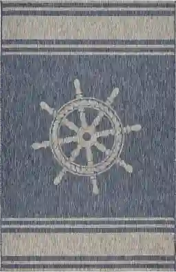 Bring a nautical inspired decor to your indoor or outdoor space by adding the stunning Merryn rug. Featuring a ship's wheel design in shades of gray and blue. This rug is machine woven with polypropylene.