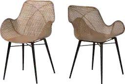 Enjoy a peaceful air for every meal with the exotic craftsmanship of the Messinia brown armchair, set of 2. This bohemian piece consists of a solid metal frame topped with a handcrafted rattan seat. The backrest slopes around the flared seat to form convenient armrests for enhanced relaxation. The Messinia utilizes angled legs for excellent stability and support in robust design. Sporting a cozy design with minimalist charm, the Messinia is sure to become a beloved part of any arrangement. Due to the nature of the natural materials used in this product, it may have variations in areas such as, but not limited to, color, pattern, grain and texture. The hair-like strands of rattan/rattan-fiber are common due to the nature of the material. Customer assembly is required.