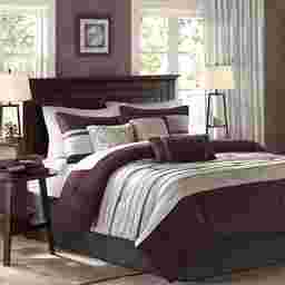 For comfort and a chic design, the Metina 7 piece bedding set is the perfect fit. Its purple comforter is made from pieced microsuede for a soft feel while the piecing details add texture and color with their gray and brown colorways. The decorative pillows add a mix of nature-inspired leaves and simple designs to combine perfectly with this collection for a simple yet dramatic look. This set includes 1 comforter, 3 pillows, 1 bed skirt and 2 shams.