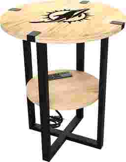 The Miami Dolphins laser etched round side table features a modern design that seamlessly blends with various decorative styles. It offers a convenient functionality for charging up to four devices at one time. The 2-Tier shelf also provides ample space to store your TV remote and other small items. Whether you are a Dolphins fan or simply appreciate well-crafted furniture, this side table is a versatile addition to any room. Customer assembly is required.
