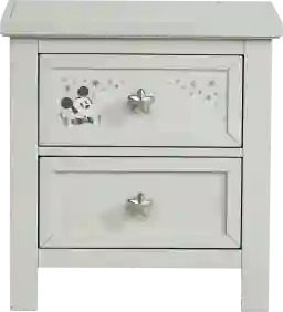 Put the "fun" in functional bedside storage with the Mickey Mouse and Minnie Mouse nightstand. Both drawers have custom brushed nickel star (or bow) pulls with room for reading materials and more. The tabletop can be used for displaying photos, collectibles and more. Crafted in a beautiful painted gray finish, the frame features removable and interchangeable art panels with fun, peaceful depictions of Mickey Mouse and Minnie Mouse in soft tones.
