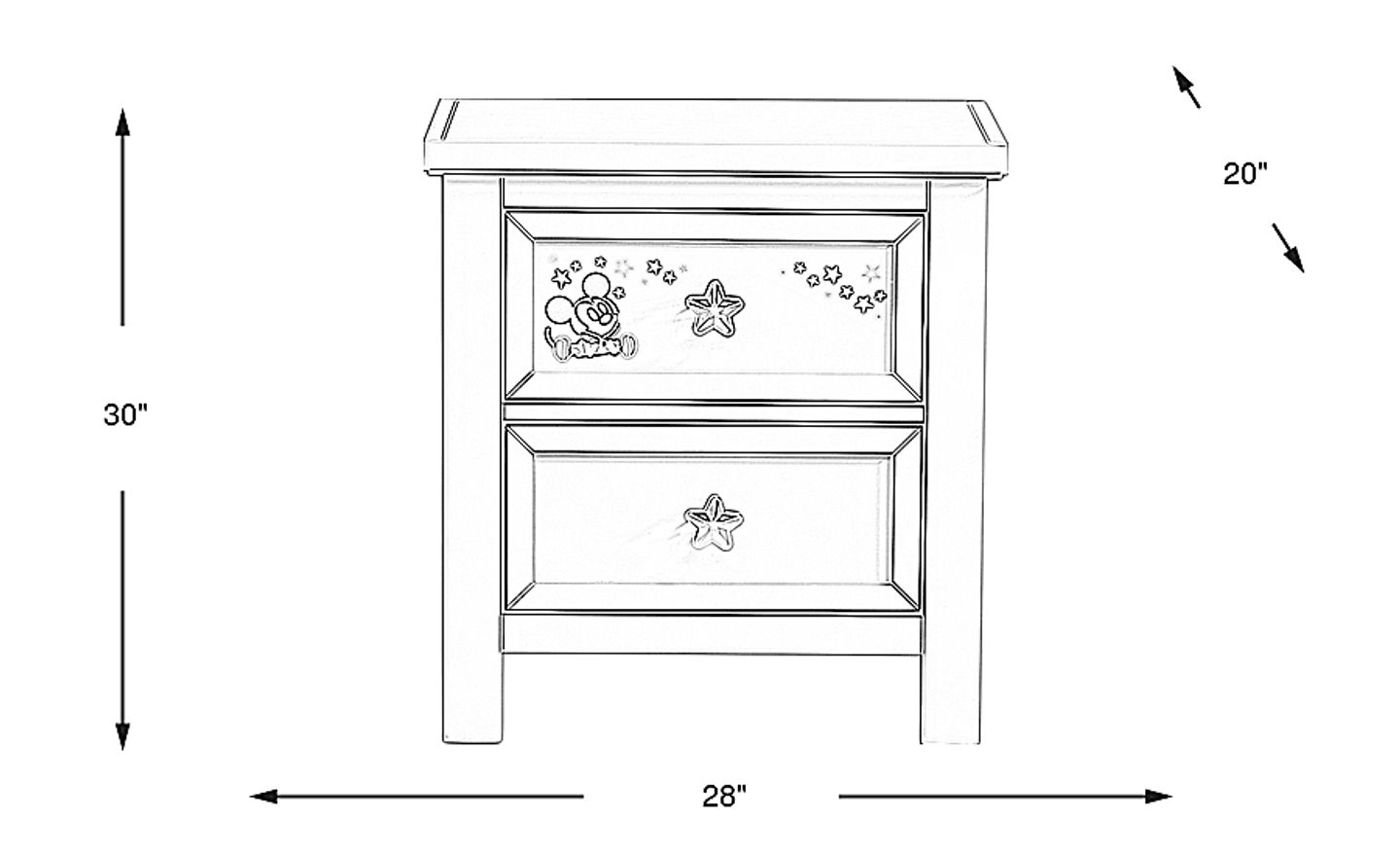 Put the "fun" in functional bedside storage with the Mickey Mouse and Minnie Mouse nightstand. Both drawers have custom brushed nickel star (or bow) pulls with room for reading materials and more. The tabletop can be used for displaying photos, collectibles and more. Crafted of hardwood solids in a beautiful painted gray finish, the frame features removable and interchangeable art panels with fun, peaceful depictions of Mickey Mouse and Minnie Mouse in full color.