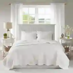 The Midean 3 piece reversible scalloped edge coverlet set is the perfect coverlet to use as a layering piece or an alternative to your comforter for a new solid look. The decorative stitch pattern in the shade of white, pairs easily with your existing decor and will sure to add a new decorative element to your bedroom with the beautiful scalloped edges. This coverlet is filled with cotton filling and features a polyester microfiber fabrication on the face and the reverse. Its prewash finish gives a worn in appearance to this decorative bedding. This set includes 1 coverlet and 2 standard shams.
