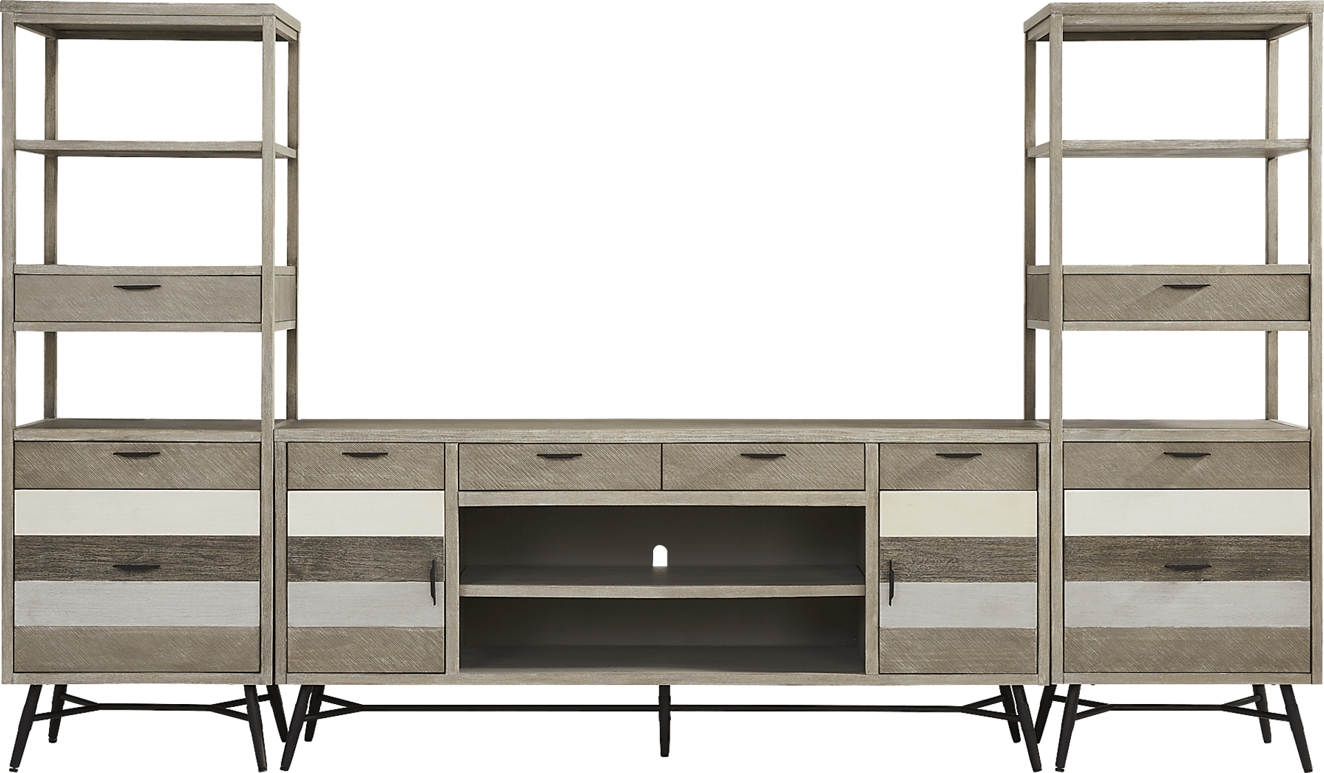 Combining the best of today's most popular designs, the Midtown Loft wall unit boasts a mid-century modern look with a hint of industrial chic style. Crafted of acacia wood and acacia veneers brushed in a variety of greyscale finishes, this contemporary styled unit is perfect for hosting all your entertainment essentials. Its 80" console offers plenty of storage with its four top drawers and two doors that reveal adjustable shelves for customizable organization. Below the center drawers is an open adjustable shelf perfect for displaying decorations and wire management holes for a clutter-free setup. Flanking the console, two symmetrical units feature three open shelves and three drawers for extra display and storage space. Black metal pulls and multi-colored panels add a dynamic visual flair while black metal trestle legs provide support and a modern edge.