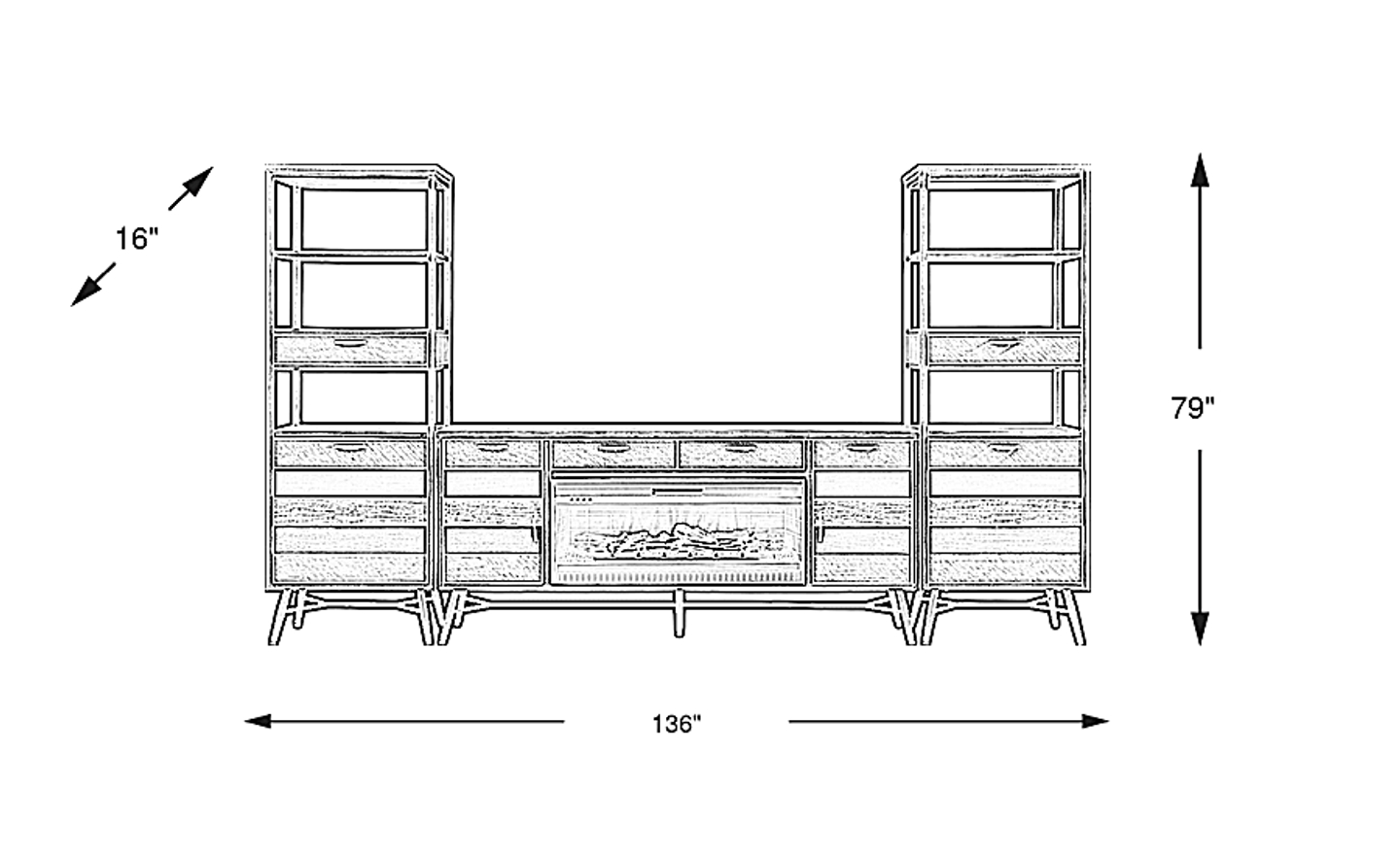 Combining the best of today's most popular designs, the Midtown Loft wall unit boasts a mid-century modern look with a hint of industrial chic style. Crafted of acacia wood and acacia veneers brushed in a variety of greyscale finishes, this contemporary styled unit is perfect for hosting all your entertainment essentials. Its 80" console features plenty of storage with its four top drawers and two doors that reveal adjustable shelves for customizable organization. Below the center drawers is a removable fireplace portion with flickering flames and faux embers, working with or without heat for a warm ambiance year-round. Flanking the console, two symmetrical units feature three open shelves and three drawers for extra display and storage space. Black metal pulls and multi-colored panels add a dynamic visual flair while black metal trestle legs provide support and a modern edge.