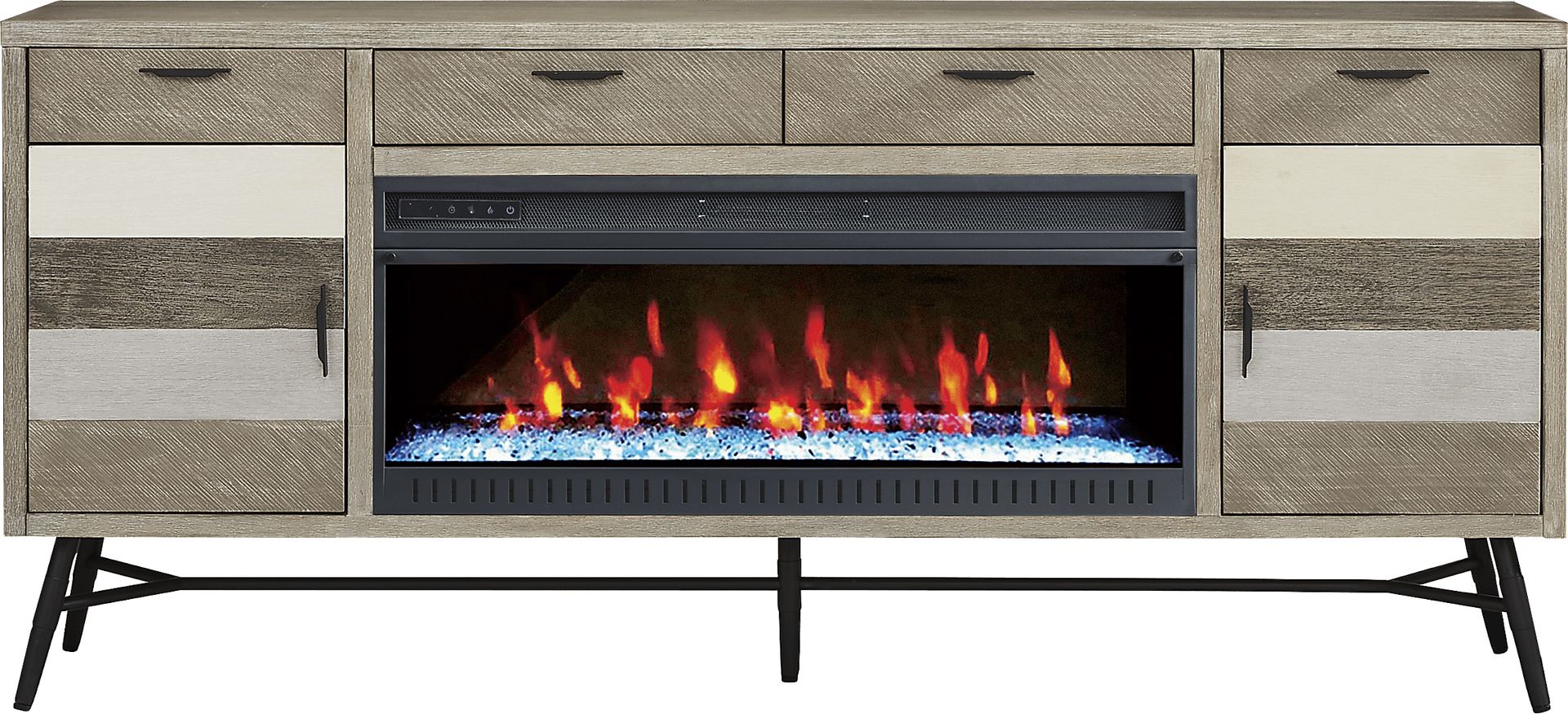 Combining the best of today's most popular designs, the Midtown Loft console boasts a mid-century modern look with a hint of industrial chic style. Crafted of acacia wood and acacia veneers brushed in a variety of greyscale finishes, this contemporary styled piece features plenty of storage space with its four top drawers and two doors that reveal adjustable shelves for customizable organization. Below the center drawers is an energy-saving LED firebox with remote controlled heat and ambient lighting with four color changing options, keeping your room's ambiance warm and cozy. Each door is adorned with black metal pulls and boasts multi-colored panels for a dynamic visual flair while black metal trestle legs provide support and a modern edge.