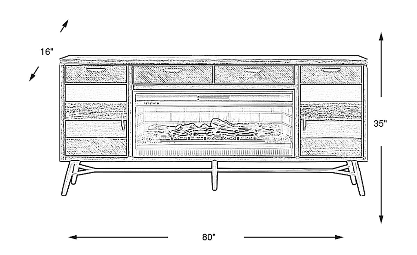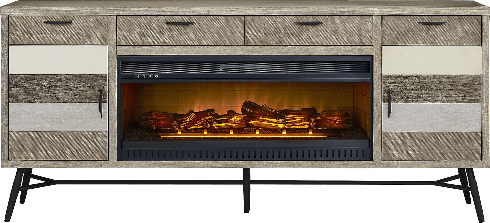 Combining the best of today's most popular designs, the Midtown Loft console boasts a mid-century modern look with a hint of industrial chic style. Crafted of acacia wood and acacia veneers brushed in a variety of greyscale finishes, this contemporary styled piece features plenty of storage space with its four top drawers and two doors that reveal adjustable shelves for customizable organization. Below the center drawers is a removable fireplace portion with flickering flames and faux embers, working with or without heat for a warm ambiance year-round. Each door is adorned with black metal pulls and boasts multi-colored panels for a dynamic visual flair while black metal trestle legs provide support and a modern edge.