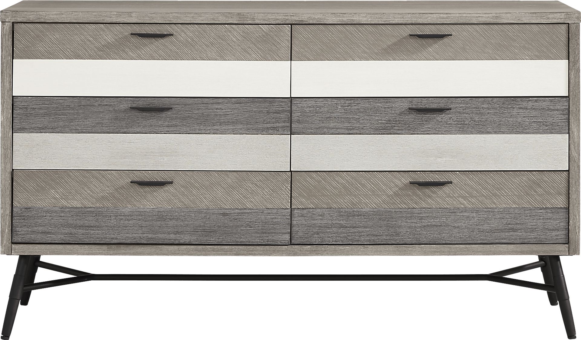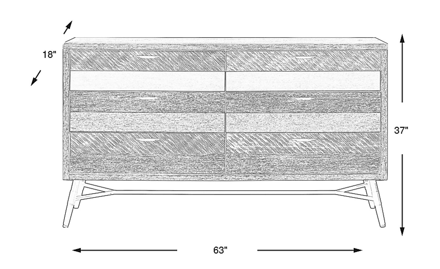 Plentiful storage and mid-century modern style make the Midtown Loft dresser an excellent choice. This bedroom essential features six spacious drawers made with English dovetail joints for strength and stability. A variety of acacia veneer patterns add interest to the front of each drawer. Industrial-inspired black hardware and angled legs make a striking contrast to the brushed multi-colored finish.