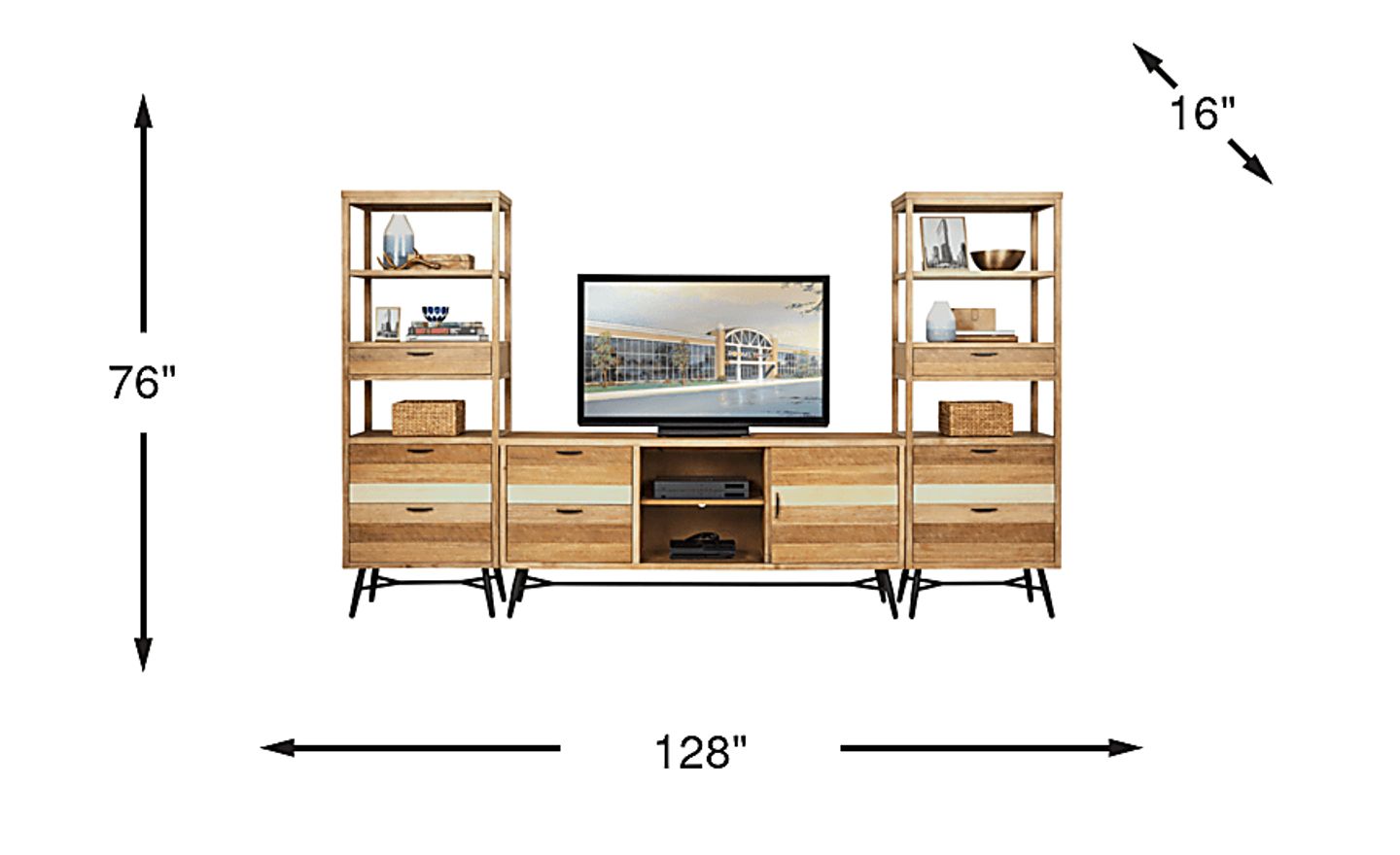 Showcasing a versatile multi natural finish and oak veneer construction, the Midtown Loft wall unit enhances any place with modern inspired style. Wide enough to support a 72" television, this pieces comes with side pieces boasting six open shelves and six drawers, while the center console comes equipped with a sliding door housing a practical shelf and two drawers for convenient storage. Slanted black metal legs evoke an industrial touch.