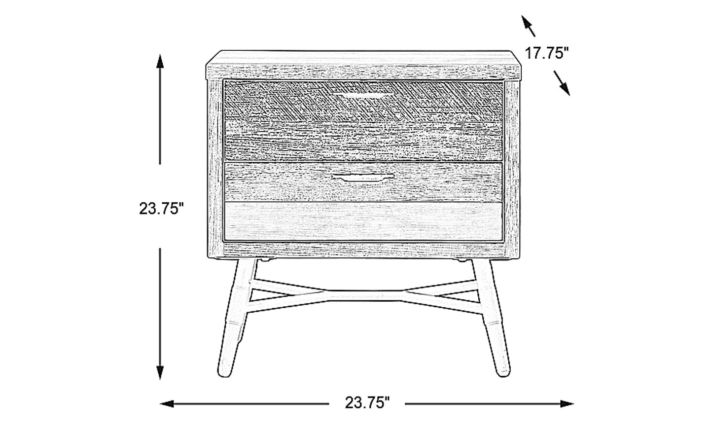 Give your bedroom a retro vibe with the Midtown Loft nightstand. This mid-century modern style is noteworthy for fusing industrial chic elements like black hardware and angled metal legs. Contrasting acacia veneer patterns draw the eye as does the brushed multi-color finish. Two roomy storage drawers are made using English dovetail joints for strength and durability. The nightstand is made with acacia wood.