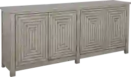 This versatile Mihash credenza works perfectly as a sleek kitchen buffet, as a server in your dining room, or as a storage and display solution for your living room. The top offers a large surface to display framed photographs, creative accents, and more. The four doors feature an eye-catching geometric pattern and open to reveal ample storage for dining linens and plates. This piece has been durably crafted from solid acacia wood and veneer giving it the ability to withstand the test of time as well as a stylish addition to any home. Customer assembly is required.