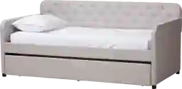 Featuring a roll-out trundle bed, the Milam sofa daybed is ideal for rooms with space constraints. Constructed from solid rubberwood and MDF wood, the Milam is foam-padded and upholstered in an elegant neutral fabric for the highest level of comfort. The daybed is fitted with a pull-out twin size trundle, providing convenient accommodation for guests. Inspired by both modern and classic elements, the daybed showcases a streamlined silhouette and button-tufting on the back panel. Customer assembly is required.