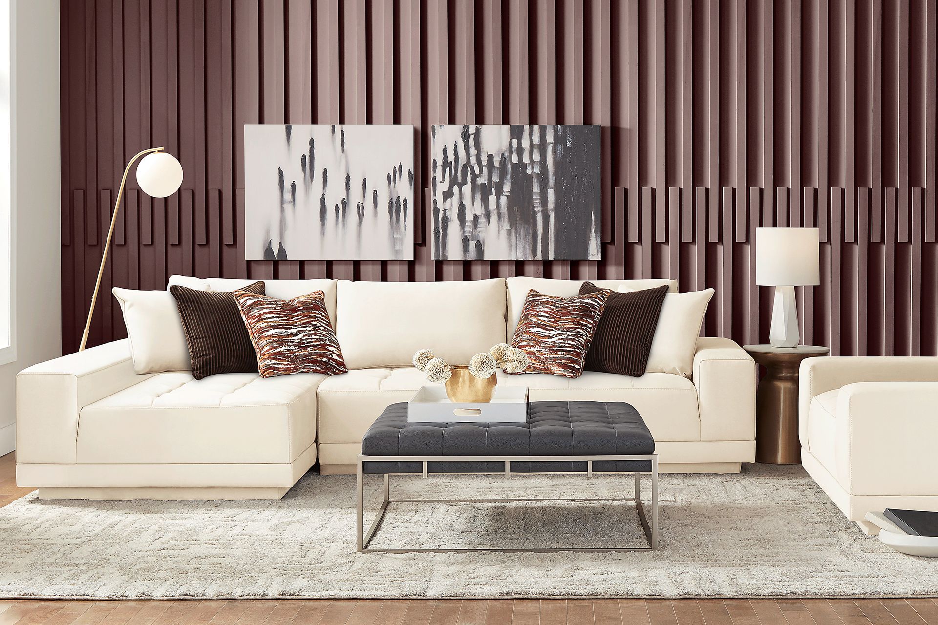 Warm nights at home enjoying quality time in the Drew & Jonathan Milano sectional are commonplace, the spacious charm touched softly by its graceful detailing and bold lines. This contemporary set features wide seats and oversized track arms upholstered in a white faux nubuck fabric, while distinctive plinth bases bring an irresistible presence. To complement the more visually dramatic details, the pillowy back cushions and biscuit tufting on the seat cushions provide gentle, relaxing curves. Two included matching pillows add a touch of adjustable comfort. Upholstery: 75% Polyurethane 25% Polyester