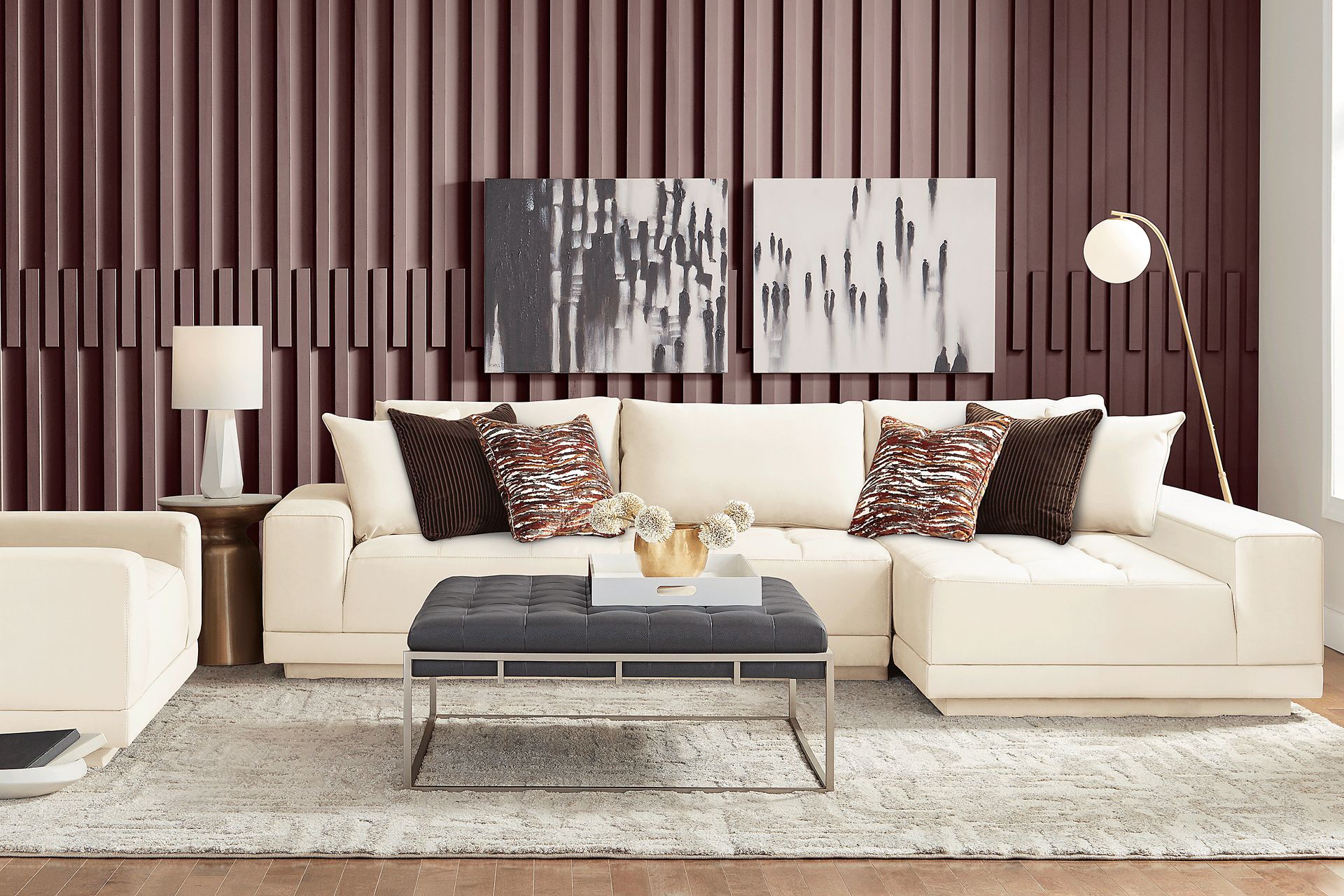 Warm nights at home enjoying quality time in the Drew & Jonathan Milano sectional are commonplace, the spacious charm touched softly by its graceful detailing and bold lines. This contemporary set features wide seats and oversized track arms upholstered in a white faux nubuck fabric, while distinctive plinth bases bring an irresistible presence. To complement the more visually dramatic details, the pillowy back cushions and biscuit tufting on the seat cushions provide gentle, relaxing curves. Two included matching pillows add a touch of adjustable comfort. Upholstery: 75% Polyurethane 25% Polyester