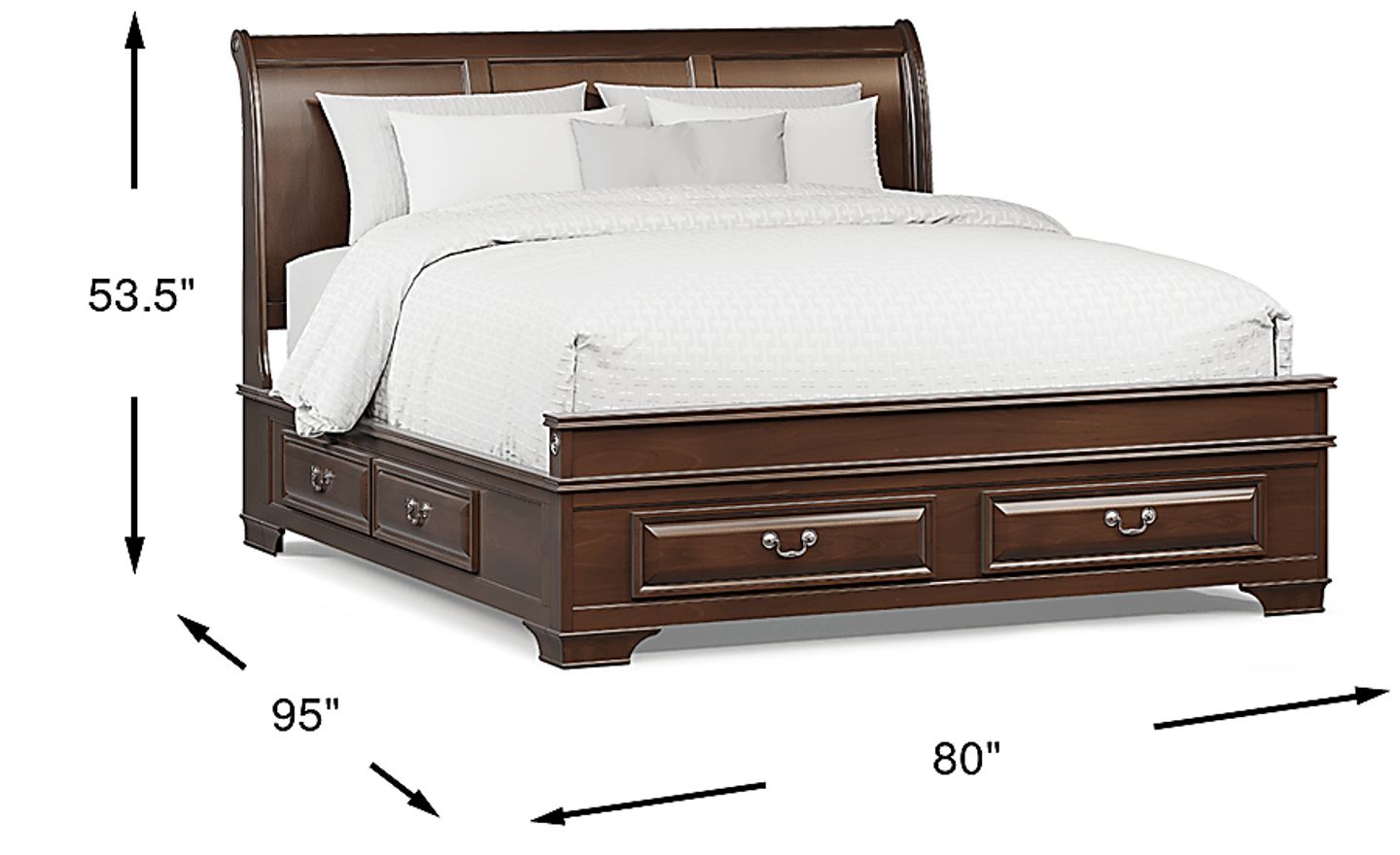 This king bed features six spacious drawers integrated into the frame to maximize organization. Because the bed is 80 inches wide, it is ideally suited for larger rooms where nightstands can be positioned to complement the grand scale of the sleigh design. When planning your layout, ensure your bedside tables are placed so they do not obstruct the drawers near the head of the bed, allowing you easy access to extra blankets, pillows, or personal affects.