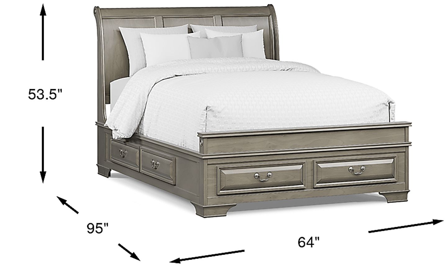 The Mill Valley sleigh bed is essential to sweet dreams and organization. With six spacious drawers, this piece is perfect for well, sleeping and storing your favorite books, blankets, pillows, pictures, knitting projects, and personal affects. Constructed with birch veneers finished in a gray color, this bed is sturdy and stylish thanks to accents such as recessed panels and antique silver finished hardware. Polished, pretty, and practical, this bed is a prime example of quality craftsmanship and sleeping in style. Mattress and foundation (if required) sold separately. Bed board required for mattress support.